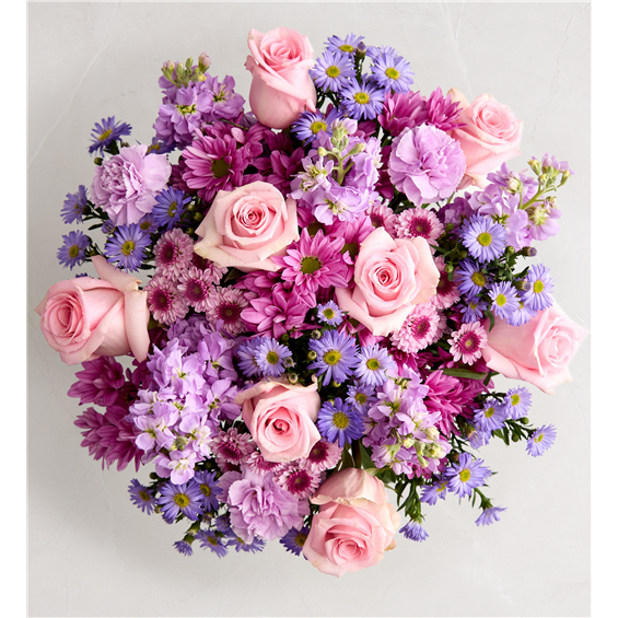 EXCLUSIVE Just like a daydream. Our delightful lavender bouquet is gathered with accents of pink and lush greenery in an embossed lavender vase that complements the delicate beauty of the blooms.
