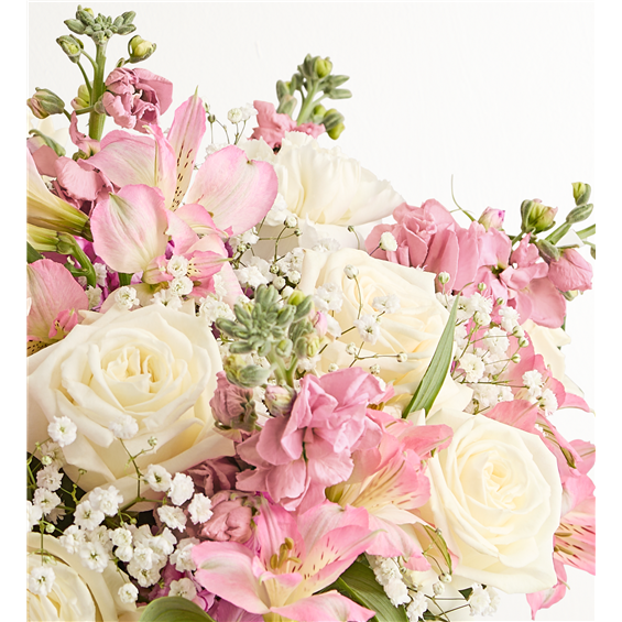 • All-around arrangement with white roses and carnations, pink Peruvian lilies (alstroemeria) and stock; accented with baby’s breath and assorted greenery